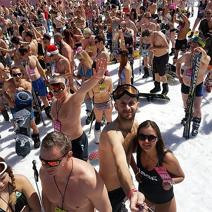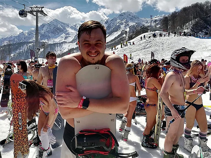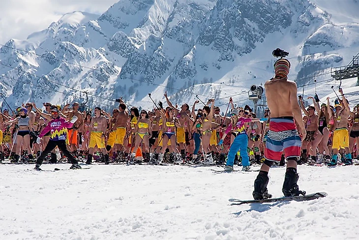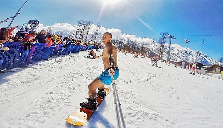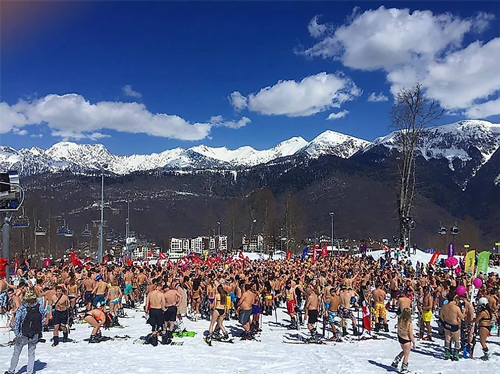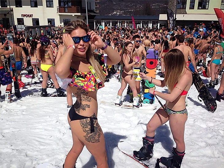На горнолыжном курорте «Роза Хутор» попытались установить новый рекорд Гиннеса. На лыжах и сноубордах с горы спустились 1200 человек. И все они в купальниках.
