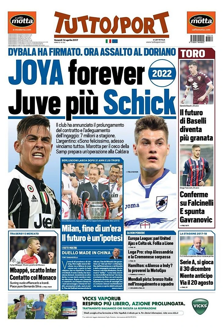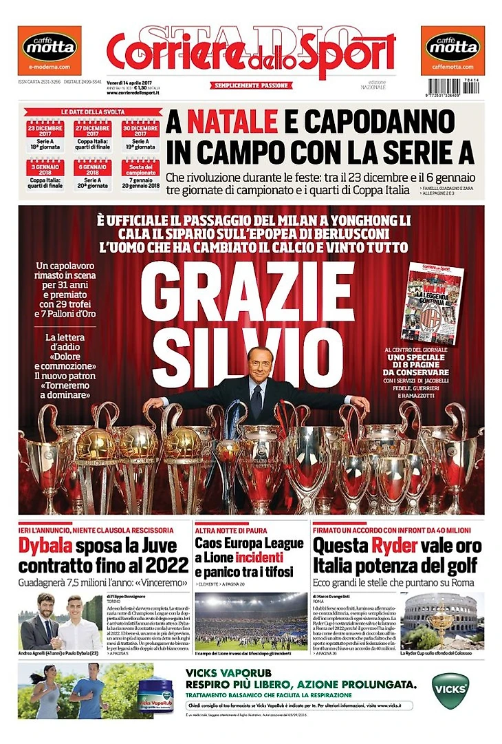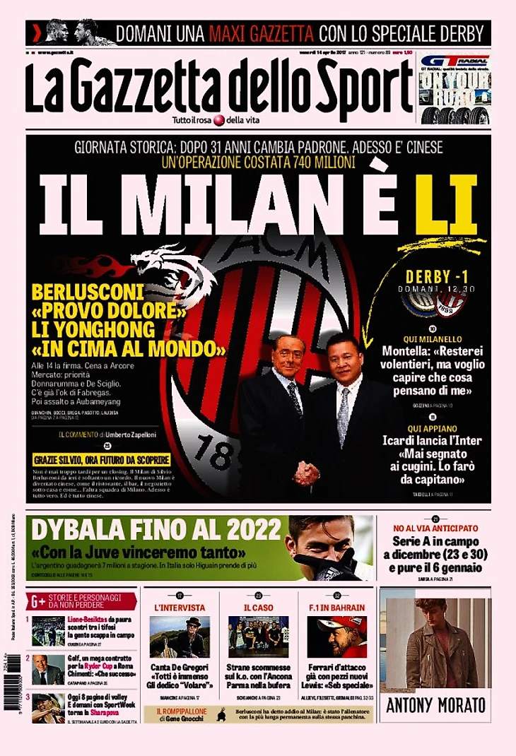 «Милан» официально продан Юнхуню Ли. Над эпохой Берлускони опустился занавес. Человек, который изменил футбол и выиграл всё. Шедевр – оставаться на сцене 31 год и завоевать 29 трофеев и 7 Золотых Мячей. Прощальное письмо: «Боль и переживания». Новый патрон: «Вернёмся к доминированию».