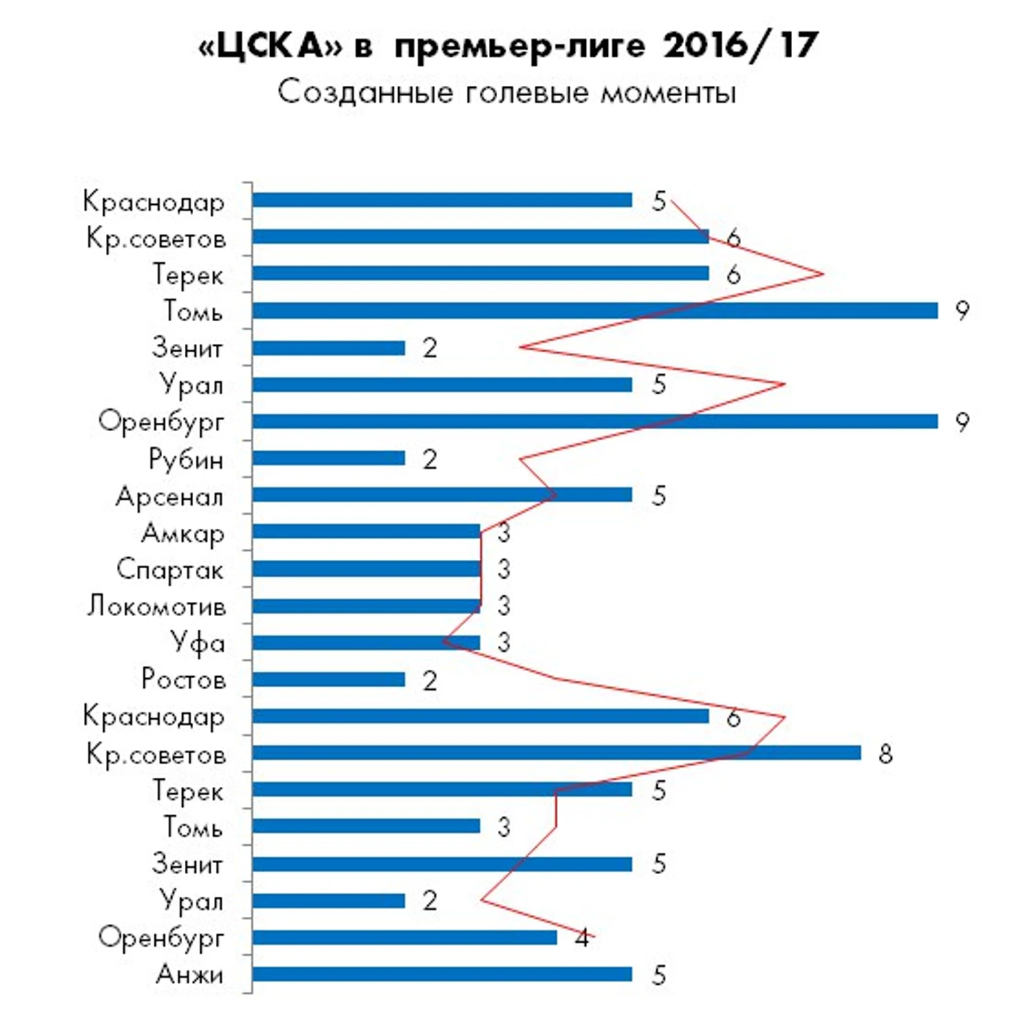 Стоит отметить, что уже в четвертом поединке подряд уровень созидательной активности ЦСКА не опускается ниже отметки в 5 голевых моментов за матч, чего ранее с армейцами в этом чемпионате не случалось ни разу.