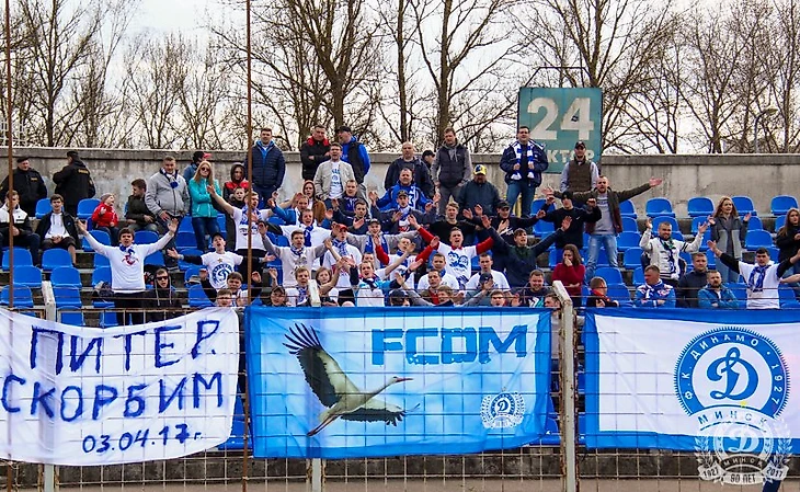 "Витебск". Полиция запрещает вывешивать баннер на секторе, поэтому парни фотографируются с ним после игры.