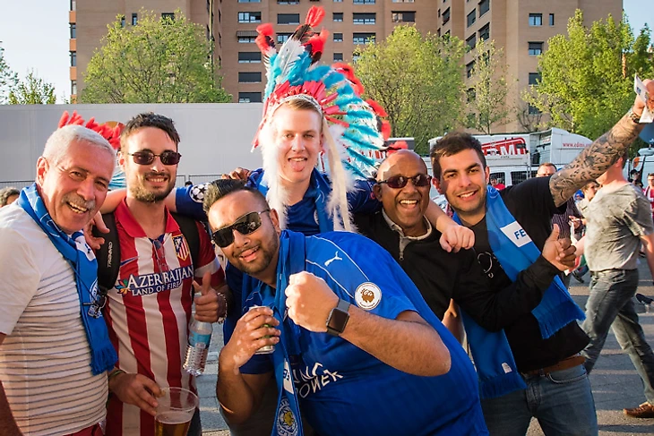 В Мадриде за 48 часов до матча концентрация английских болельщиков, не изменяющих привычке приезжать в город, пить пиво и петь про «don’t take me home», не так очевидна. В большом городе фанаты растворяются в паутине улиц и оседают за столики баров с дешевым алкоголем, но даже в начале лигочемпионской недели первое, что встречает меня на Пуэрта дель Соль, – вывешенный из окна лестерский флаг.