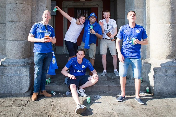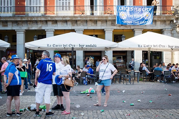 Страсти разгораются в центре города к вечеру. Площадь болельщиков «Лестера» хрустит под ногами пластиковыми стаканчиками из под пива, фанаты распевают песни во славу Варди и парней, и на все это хмуро смотрит испанская полиция. Она же осторожно перекрывает все выходы с площади. Агрессии в воздухе нет, только отпускное ощущение и стойкий запах перегара.
