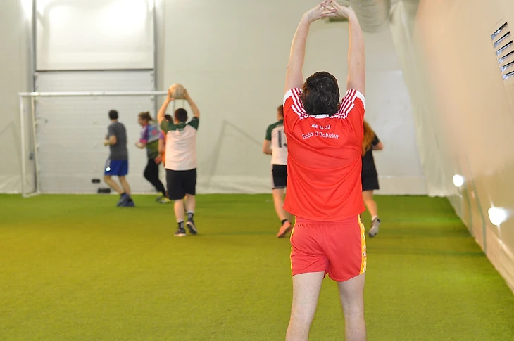 Алан делит команду на две половины, мы становимся в большие квадраты и отрабатываем одно из главных движений гэльского футбола: передаем друг другу мяч, ударяя по нему рукой. Важно не делать этого кулаком, но и не использовать кисть, потому что после нескольких тренировок ее легко отбить. Передача в гэльском футболе напоминает ту самую подачу снизу, которую девочки и некоторые мальчики (например, я) обычно используют в школьном волейболе.