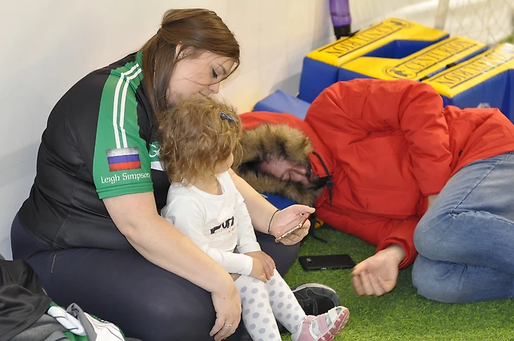 Пока взрослые выбивают друг другу пальцы, дети сидят на матах или ползают возле конусов и манишек. Одна не самая спортивная семья в формах Moscow Shamrocks все полтора часа пролежала возле ворот: девочка смотрела мультики, мама закрывала ее каратистскими лапами, а папа, как Андрей Аршавин, спал на мягком газоне и просыпался ровно два раза, чтобы ввести мяч в игру.