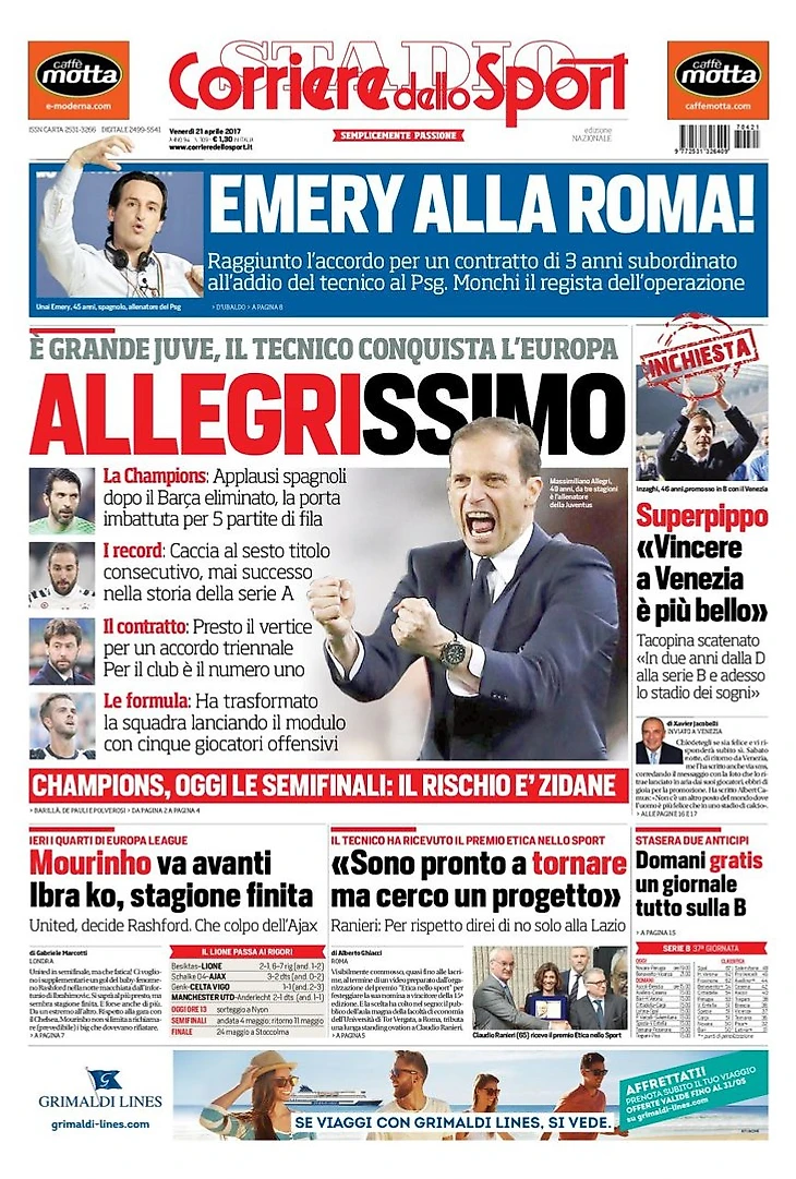 «Аллегриссимо». Заголовки Gazzetta, TuttoSport и Corriere за 21 апреля