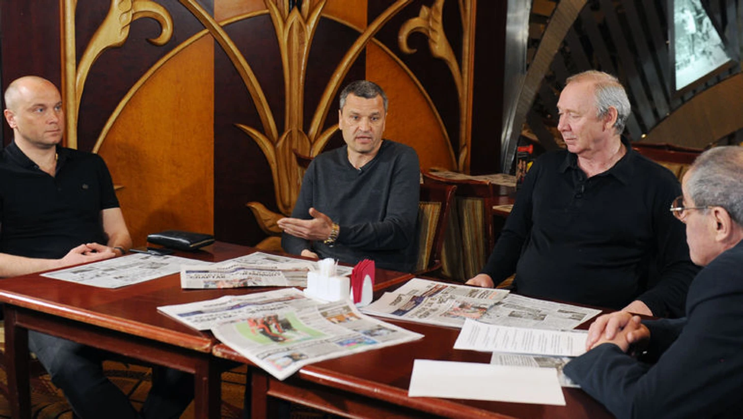 10 апреля. Москва. Дмитрий ХОХЛОВ, Юрий НИКИФОРОВ и Олег РОМАНЦЕВ (слева направо) на съемках передачи Александра ЛЬВОВА "Футбол по Романцеву". Фото Александр ФЕДОРОВ, "СЭ"
