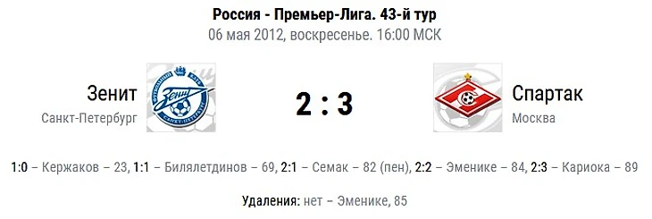«Зенит» — «Спартак» — 2:3 (Кержаков, 23, Семак, 82 — с пенальти — Билялетдинов, 70, Эменике, 84, Кариока, 89)