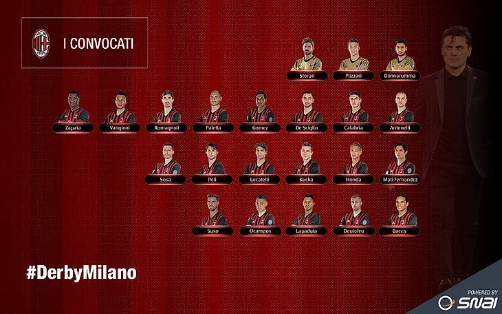 Большая надежда в этой игре выпадет на плечи испанского вингера «Милана» Сусо, триумфально вернувшегося на поле в матче минувшего тура, после своего месячного отсутствия. Особенно, памятуя о игре испанца в прошлом дерби, когда тот феноменальным образом оформил дубль в ворота кузенов. Однако, усилиями Ивана Перишича «Интер» смог уйти от поражения на последних минутах игры первого круга.