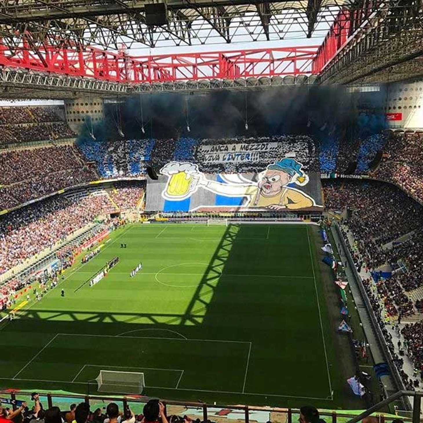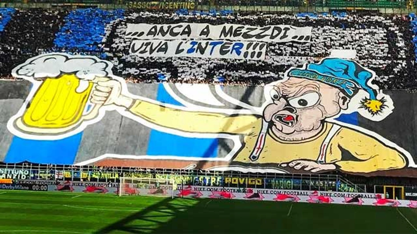 Но это было по ходу игры. А одновременно с выходом команд на поле обе заворотные трибуны развернули свои перфомансы. "Черно-синие" не стали мудрить - посыл их перфоманса был прост: "Даже за кружкой пива: Вперед, Интер!". Сопроводили всё это дело черно-синими дымами.