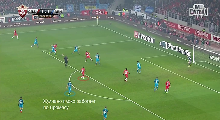 О характере игры Жулиано во вчерашнем матче скажет цифра 1 Impect – бразилец своими передачами за весь матч отрезал всего одного защитника «Спартака». Он почти в два раза меньше принимал передачи и отдавал вперёд, что рисует чёткую картину игры «Зенита». Вероятно, такая ситуация сказывалась и на нервном состоянии Жулиано: во втором тайме его навесы летели в молоко, а попытка отдать острую передачу при счёте 0:1 получилась небрежной и принесла на ворота «Зенита» контратаку.