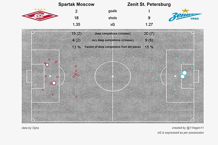 За 90 минут «Зенит» соткал всего одну острую атаку через центральную зону – когда Юсупов попробовал вывести тонкой передачей на ворота Дзюбу, со второй попытки выкатил на ударную позицию Шатову, а Олег выстрелил в ближний угол вместо дальнего. Всё. Остальные попытки наступления – передачи на фланг под подачу на Дзюбу. Нельзя сказать, что это не работало – если брать вес моментов по xG, два самых опасных момента в матче были как раз у Дзюбы, гол и промах выше пустых ворот на 88-й минуте; вдобавок был эпизод в начале второго тайма, когда Артём принимал мяч во вратарской и готовился пробить, но не совладал с отскоком. То есть защита «Спартака» трижды создавала для Дзюбы комфортную ситуацию – но это не секрет, традиционные проблемы красно-белых в защите никуда не делись.