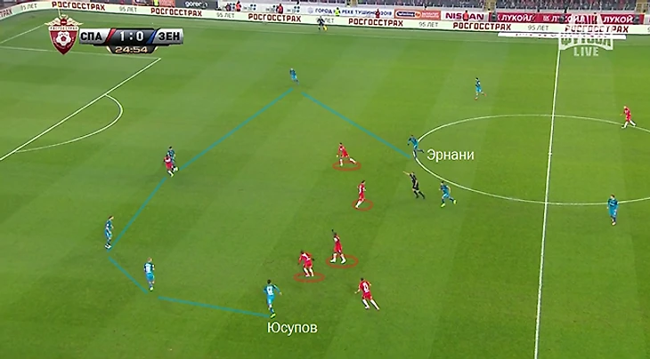 Связка Юсупов – Эрнани, придуманная Луческу благодаря ротации после проигрыша «Амкару», слишком легковесна, чтобы бороться на равных с Фернандо, Глушаковым и Зобниным. Юсупов пробовался опорным хавбеком в «Динамо», но гораздо сильнее заиграл, когда Артура страховал Игорь Денисов, а сам Юсупов выдвигался на позицию «восьмёрки». Эрнани анонсировали как прямую замену Акселю Витселю – то есть тоже как «восьмёрку». На двоих они выиграли 50% единоборств, 7 из 14, но плохо играли позиционно: одно проигранное единоборство, как у Артура Юсупова на скриншоте, полностью распахивало центральную зону «Зенита».