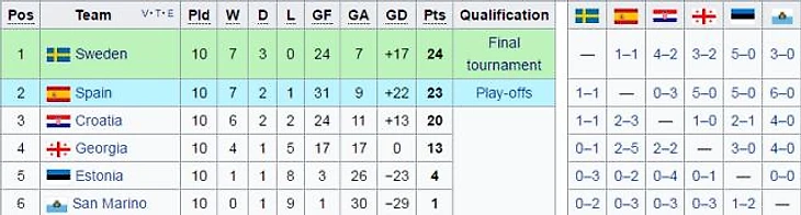 7 побед, 3 ничьи и ни одного поражения! Сборная Швеции великолепно провела весь отборочный цикл, несмотря на очень непростую группу, в которой её главными соперниками были сборные Испании и Хорватии. Оба матча с испанцами были невероятно сложными и закончились с одинаковым счетом 1:1. Такой же счет был зафиксирован и в гостевом матче против хорватов, а вот в Швеции, в заключительном матче группового турнира, хорваты были обыграны 4:2. Роскошная командная игра, сумасшедший настрой, великолепные "кружева" и комбинации, пожалуй, это был лучший матч этой сборной.