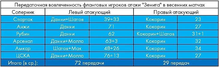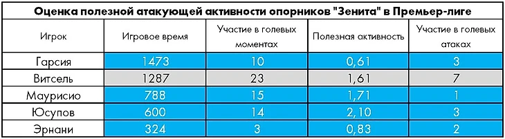 Из пятерки зенитовских опорников откровенно слаб в созидании Хави Гарсия и пока немногим лучше выглядит Эрнани (но по бразильцу выводы делать рано, потому как небольшое игровое время формирует существенную измерительную погрешность). Уровень полезной активности Витселя, Маурисио и Юсупова вполне сопоставим, так что проблемы в развитии атак с уходом бельгийца, на мой взгляд, никак не связаны.
