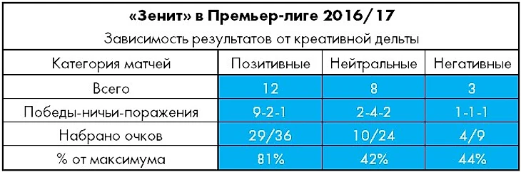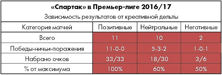 11 из 23 матчей Премьер-лиги стали для «Спартака» позитивными (с креативной дельтой +2 и более), и ни в одном из них команда Карреры очков не теряла, тогда как «Зенит» игровое преимущество реализовывал с меньшей эффективностью.