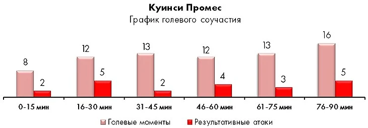 На сей раз «летучий голландец» был в строю, и с его опекой оборона гостей, по большому счету, не справилась. В третьем матче подряд Куинси выполнил «норму гиперактивности», создав для себя и партнеров 5 голевых моментов (эта планка покорилась Промесу уже в 8 раз в сезоне).