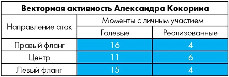Редкие контакты Кокорина с мячом иногда оборачиваются опасными ситуациями, но в подавляющем большинстве случаев они связаны с его смещением в зону центрфорварда, при этом как крайний нападающий он практически бесполезен. К слову, последняя результативная позиционная атака с правого фланга, в которой он отметился полезным атакующим действием, случилась аж в 10 туре (в гостевом матче с «Уралом»).