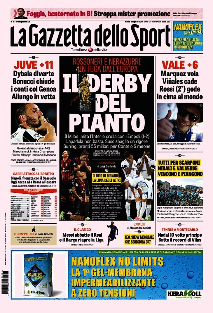 Россонери и Нерадзурри в забеге к Европе. «Милан» повторяет «Интер» и терпит крах с «Эмполи» (1:2). Лападулы не хватает, Сусо мажет пенальти. Suning, готовы 55 миллионов для Конте или Симеоне.