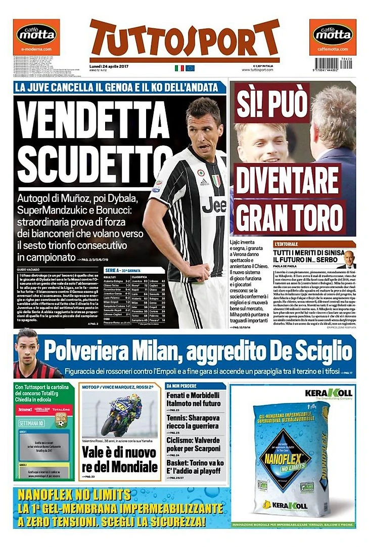 «Дженоа» повержена 4:0, Скудетто всё ближе. За один тур никогда не было так много голов: у нас уже 43. Сразу автогол, затем забили Дибала, Манджукич и Бонуччи. Аллегри поднимается на 11 очков над «Ромой», которая сегодня вечером штурмует «Пескару».