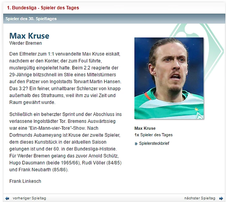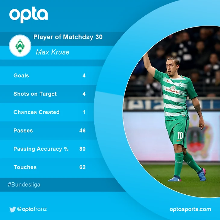 Макс Крузе также первый игрок с 1986 года, забивший в одной игре 4 гола за Бремен.