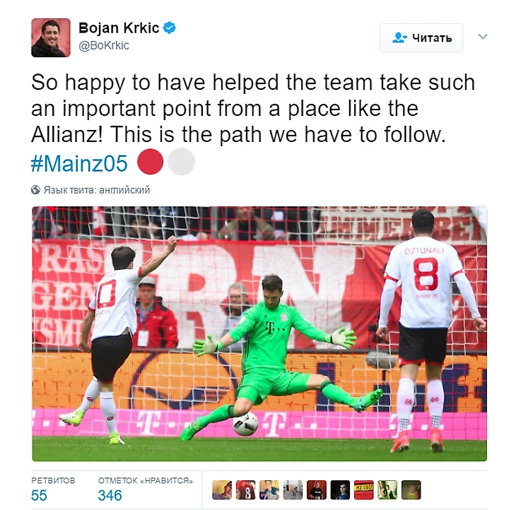 После перерыва «Бавария» пришла в себя, много атаковала, сравняла счет (отличился Алькантара), в концовке матча так и вовсе висела на воротах соперника, но «Майнц» выстоял, взяв важное для себя очко. А вот «Бавария» пока откладывает оформление чемпионства и готовится, пожалуй, к важнейшему из оставшихся в сезоне матчей, полуфиналу Кубка Германии с дортмундской «Боруссией». Игра состоится уже в эту среду.
