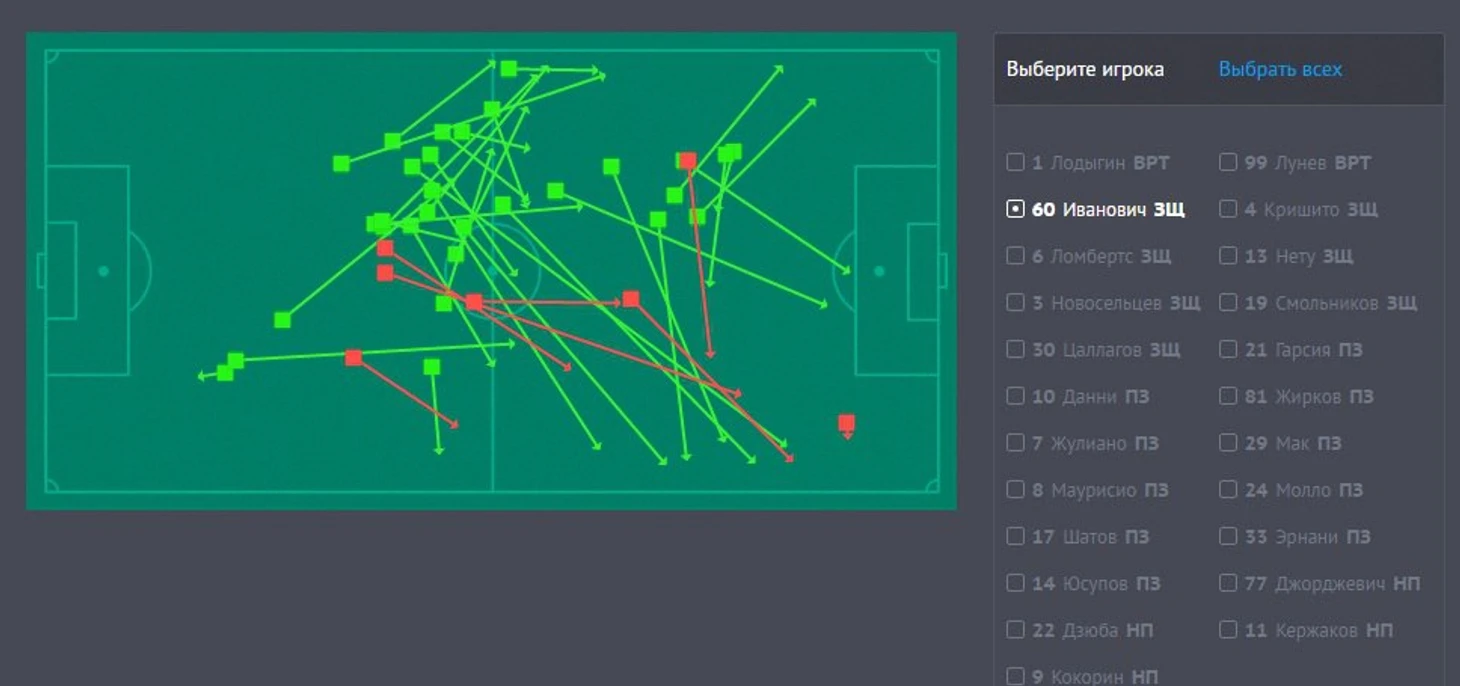 Рис. 2. Точные и неточные передачи Б. Ивановича в матче с Уралом