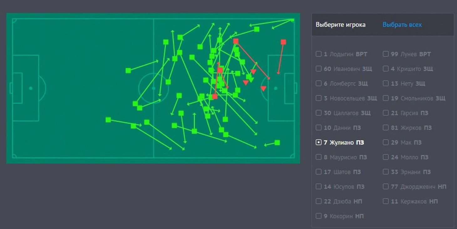 Рис. 6. Точные и неточные передачи Жулиано в матче с Уралом