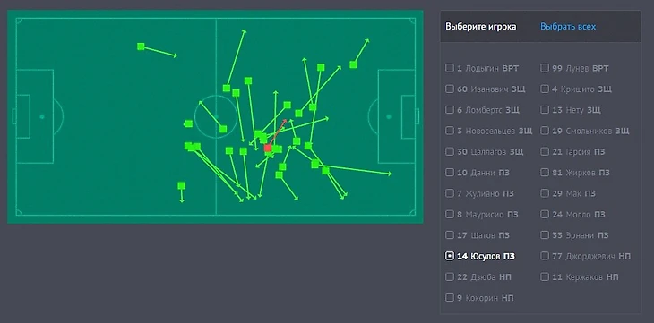 Рис. 1. Точные и неточные передачи А. Юсупова в матче с Уралом