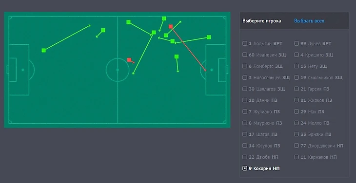Рис. 3. Действия А. Кокорина в матче с Уралом (за 44 минуты игрового времени)