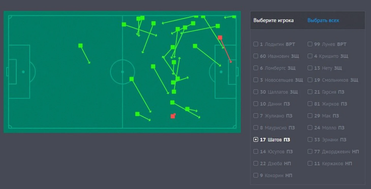 Рис. 4. Действия О. Шатова в матче с Уралом (за 47 игровых минут)