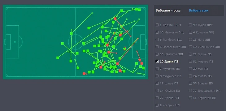 Рис. 5. Точные и неточные передачи Данни в матче с Уралом