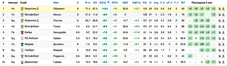 F_5, aF_5 – средние набранные футболистом фо за последние 5 сыгранных игр и форма игрока за последние 5 календарных игр команды, независимо играл ли он или нет. Вот тут именно aF_5 – очень полезный показатель, показывающий текущую форму футболиста, хотя конечно SpG и KeyP, которые мы обсуждали выше полезнее, но зато этот не требует временных затрат.