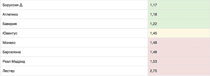 Коэффициентов бывает огромное множество. От ставок на количество желтых карточек в матче, до ставок на то на какой минуте забьют первый гол в матче, нас, в рамках ОФС, интересует только два вида коэффициентов – прогноз на гол команды и прогноз на сухарь команды. Есть и альтернативное мнение, у ряда сильных игроков, они считают, что важнее коэффициенты на матч, нежели на гол, потому что кэф на гол показывает вероятность одного гола, а кэф на матч – вероятность большого количества голов. Кроме того нас иногда может интересовать тотал забитых мячей, но это будет нечасто и чтобы вас не запутать давайте сфокусируемся на ставках на гол и на сухарь. Вам надо выписать коэффициенты с Марафона и по итогу у вас получится что-то вроде такой таблички (тут приведены коэффициенты на гол ¼ ЛЧ, чем меньше коэффициент, тем выше вероятность):