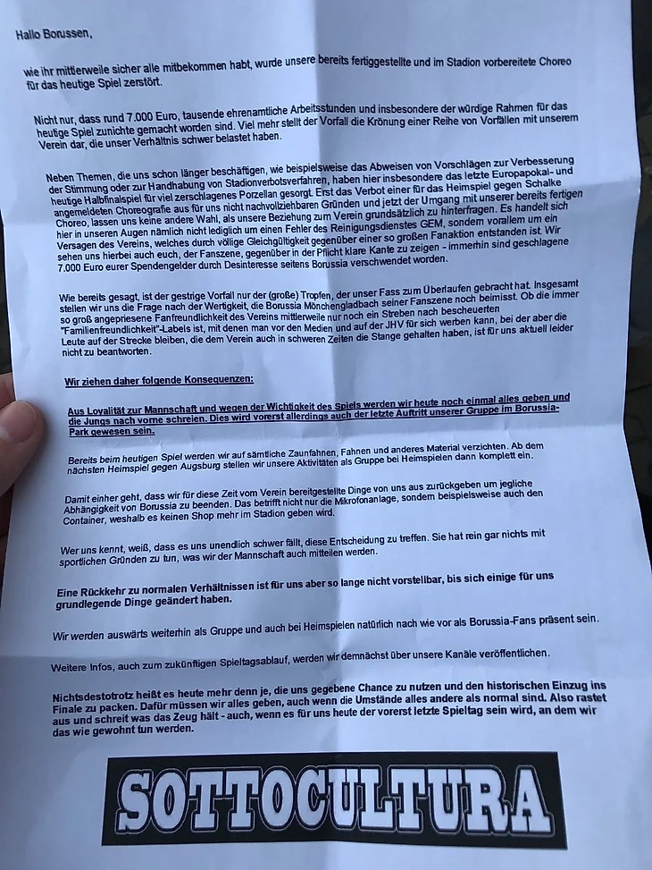 Сама группа "Sottocultura" вчера решила отказаться от всех визуальных элементов поддержки (в частности от флагов и баннеров) и сосредоточиться на голосовой поддержке команды, к чему и призывала всех остальных фанатов: "Мы должны приложить все усилия, чтобы выиграть! Мы собираемся в Берлин!". При этом фанаты заявили, что этот матч будет последним на "Боруссия-Парк", в котором ультрас оказывают активный суппорт и что уже со следующей домашней игры против "Аугсбурга" начинается бойкот. Он не будет распространяться на выездные игры. Оповещение основной массы болельщиков было сделано с помощью листовок, которые раздавали перед игрой - в ней, в частности, подробно рассказали и о происшествии перед игрой, послужившем причиной самого бойкота ближайших домашних матчей команды.