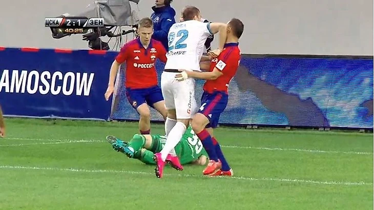 12 сентября 2015, ЦСКА – «Зенит», 40-я минута матча: в штрафной ЦСКА борются Игнашевич и Дзюба, оба используют руки и "обнимают" друг друга. Дзюба толкает Игнашевича и локтем бьет «армейца» прямо в лицо со всей силы. Игнашевич теряет баланс, но не падает, и не обращается к судье. Мужик! (с)