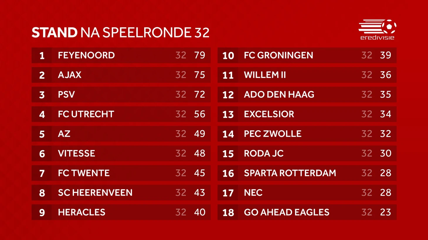 Всего два тура осталось до завершения сезона в Голландии! 32-й игровой уик-энд прояснил многое в турнирной борьбе. Всё самое интересное как всегда в традиционном обзоре.