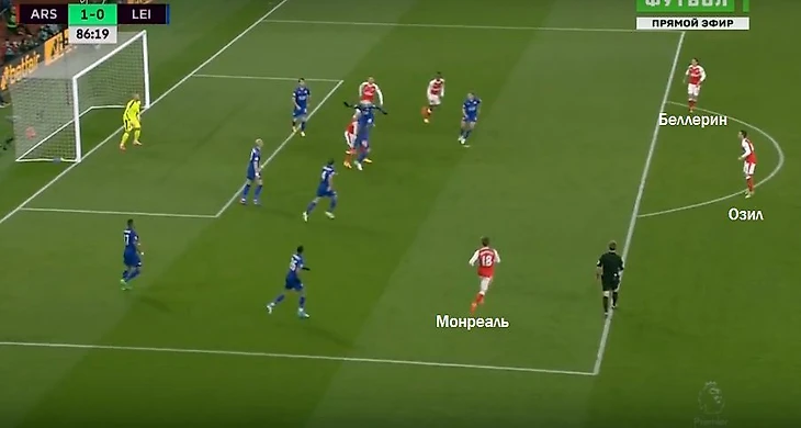 Очередную подачу в штрафную площадь защитники «Лестера» отбили, но мяч был подобран Озилом, который скинул игровой снаряд на Монреаля. Испанец не то пробил, не то простреливал на Жиру, но попал в живот Хуту, от которого мяч срикошетил в ворота. Грамотное расположение Озила и Монреаля для очередного подбора мяча позволило соорудить этот гол. Сразу три игрока хозяев были в гордом одиночестве, пока «Лестер» зачем-то всемером прижался к вратарской.