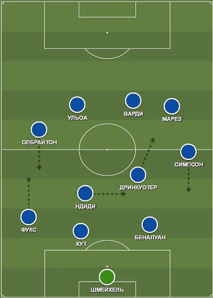 В свою очередь, в защите «Лестеру» порой приходилось перестраиваться и даже по ситуации играть в пять центральных защитников, чтобы сдерживать атаки хозяев. В таком случае Олбрайтон отходил на место крайнего защитника, а Фукс садился ближе к центру. Получались полноценные 3-5-2. Довольно популярный метод для этой команды, часто наблюдаемый в том числе и в Лиге Чемпионов во время матчей с напористыми соперниками.