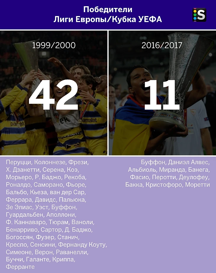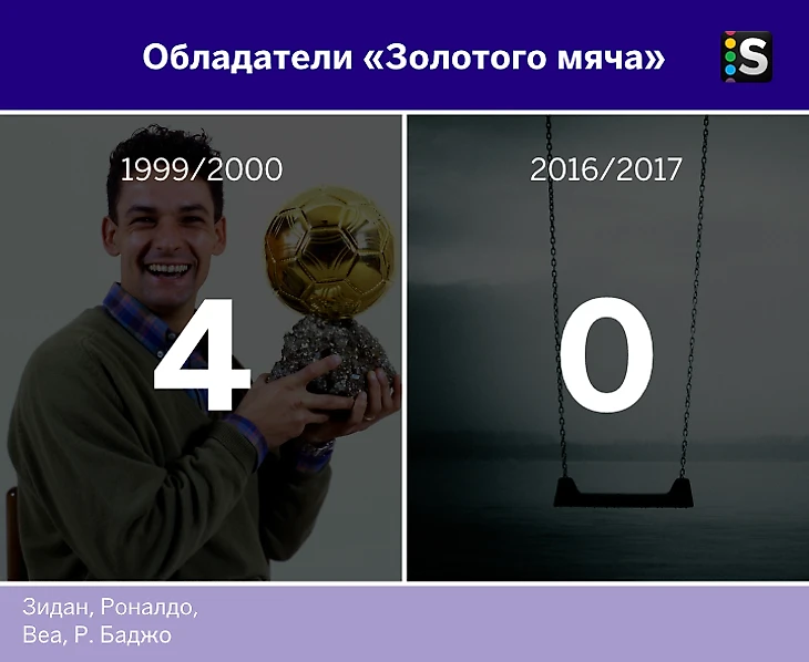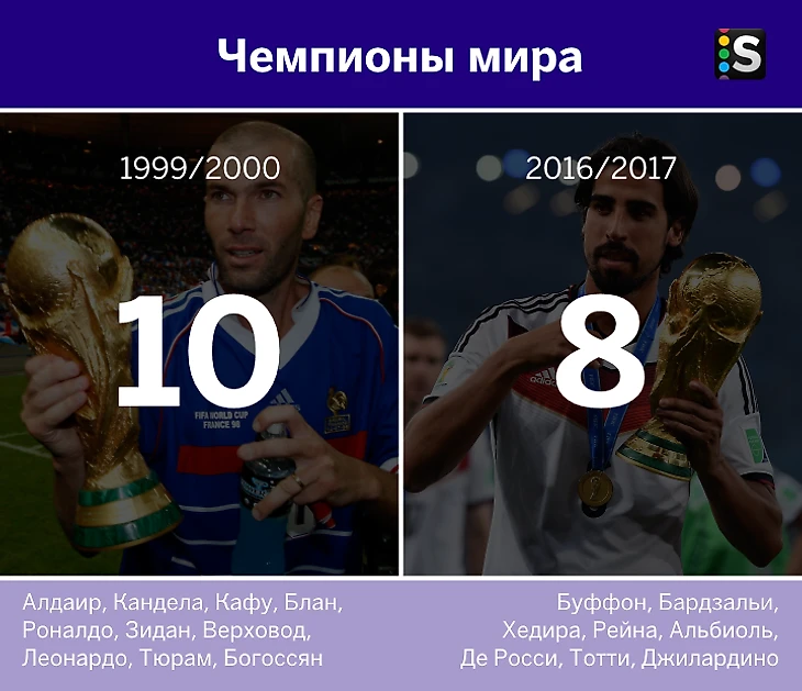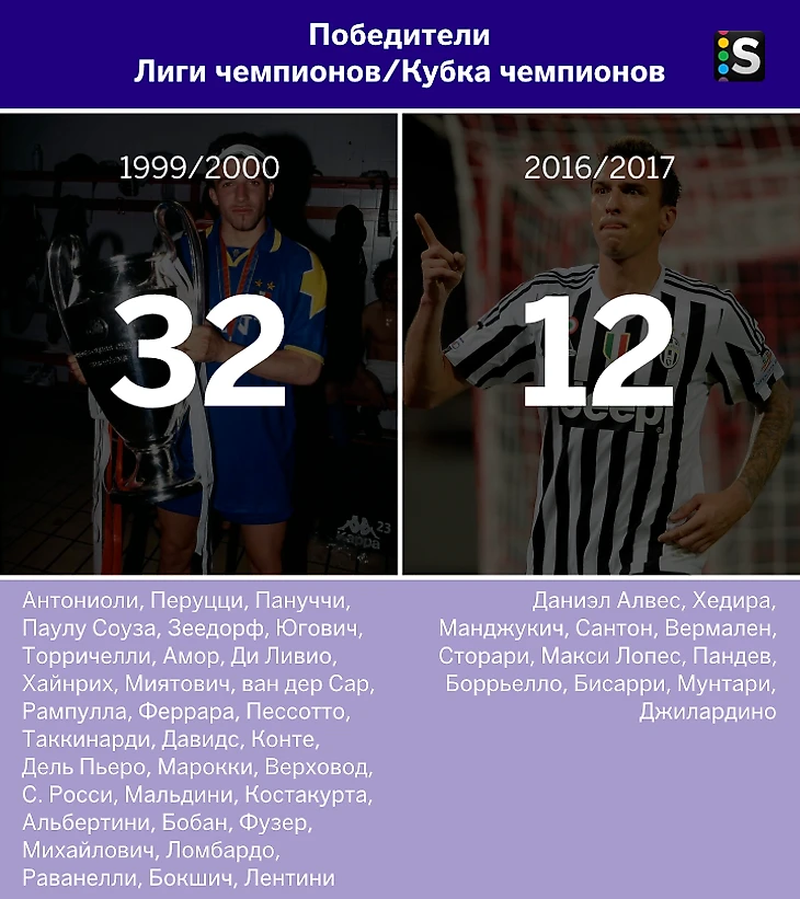 Сравним составы команд последнего сезона XX века и текущего на предмет титулованных игроков. Возьмем пять самых престижных командных трофеев и два индивидуальных.