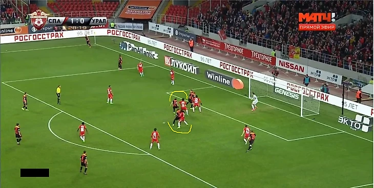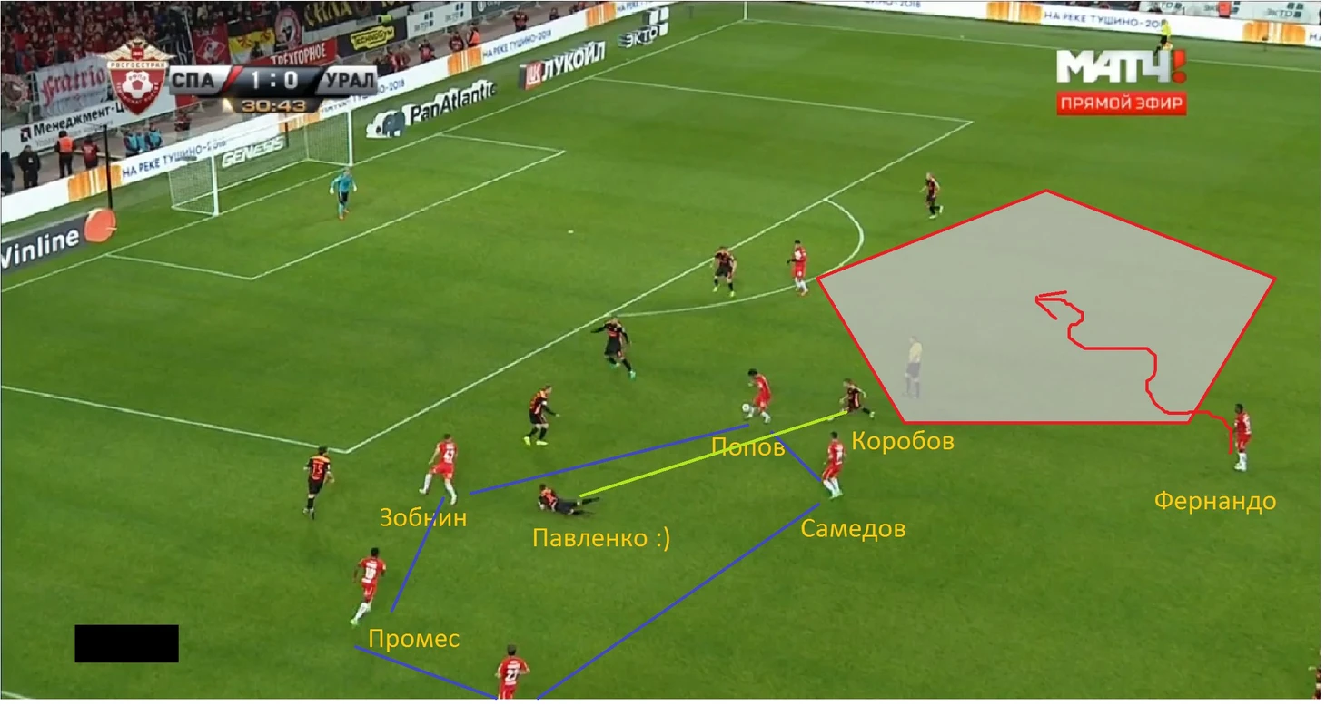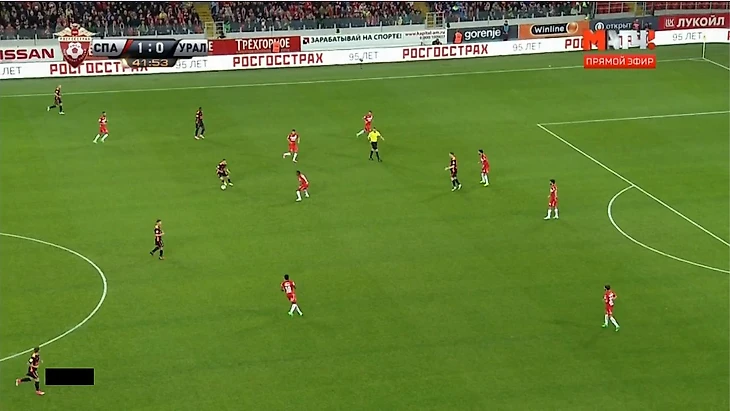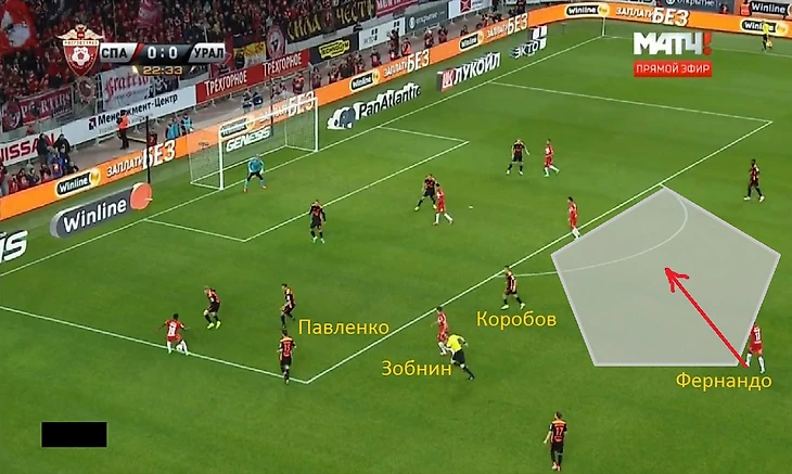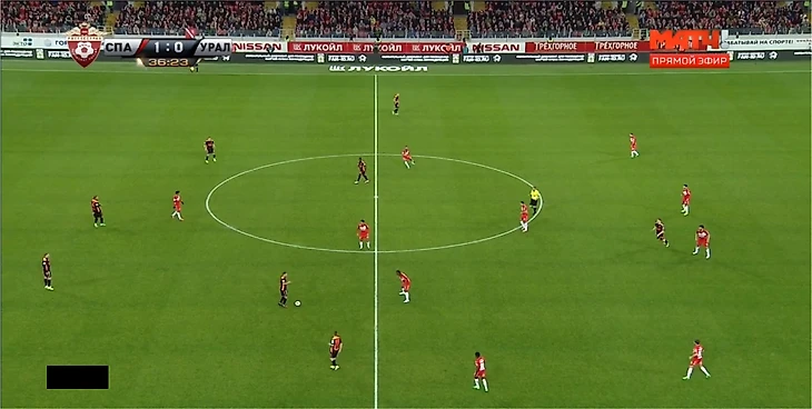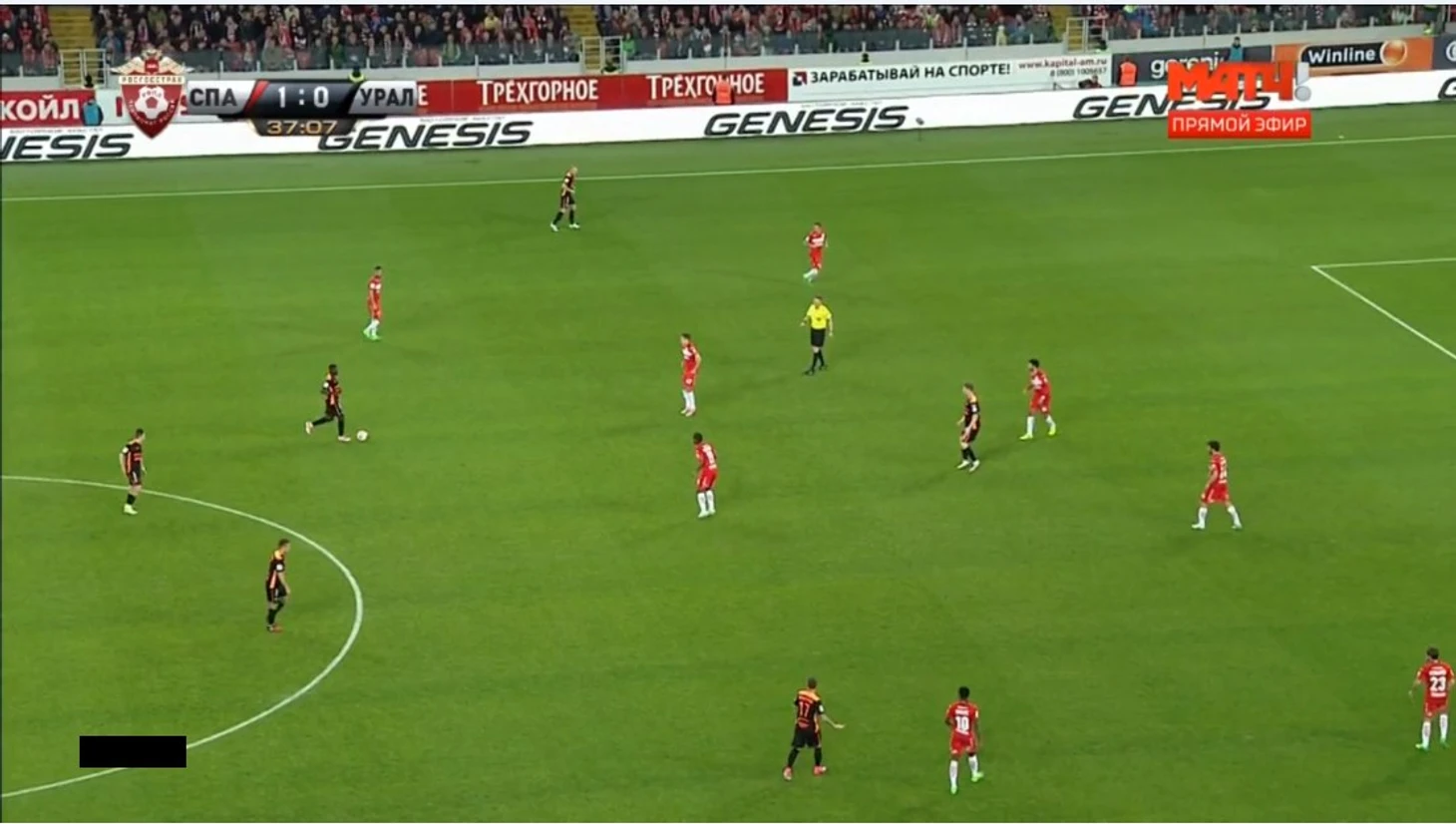 Два центральных полузащитника Урала (Павленко и Коробов) вынуждены были смещаться на левый полуфланг, оголяя зону перед сегментом.