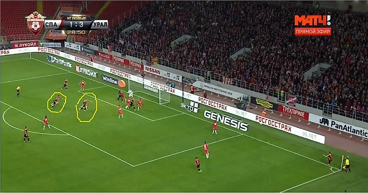 Но стоит отметить игру Урала на стандартах в атаке. 4 из 5 ударов за матч гости нанесли после подачи с угловых или штрафных. Главной целью было создание изоляций для высоких центральных защитников в зоне 11-ти метровой отметки.