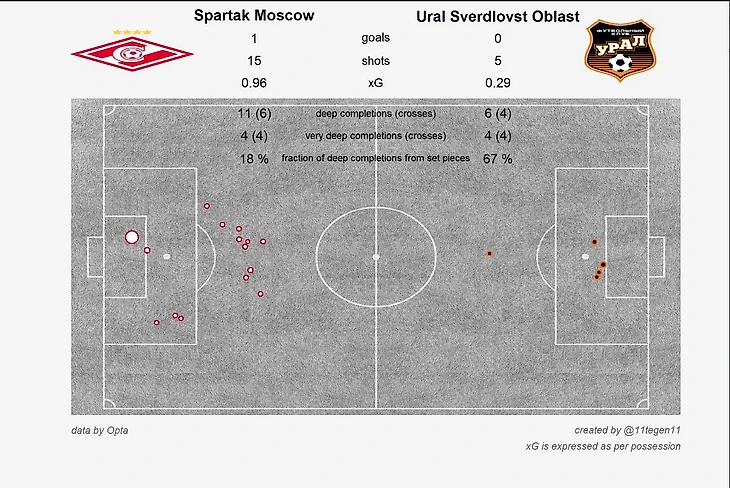 В результате Спартак провел 44% атак левым флангом и нанес 73% ударов из центральной зоны, один из которых оказался голевым.