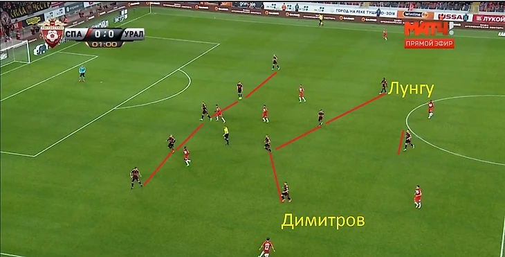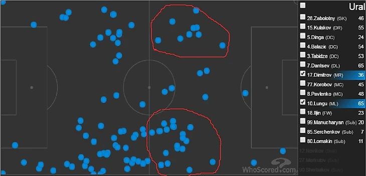 Схема позволяла защите Урала иметь численное преимущество в зоне мяча как в центре, так и на флангах. Это достигалось засчет крайних полузащитников (Лунгу и Димитрова), занимающих глубокие позиции в полуфлангах. Карта касаний Лунгу и Димитрова.