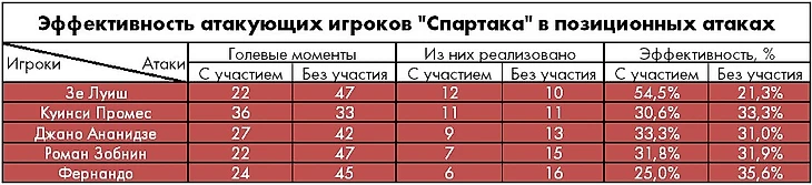 Как показывают цифры, наиболее чувствительной для красно-белых является потеря Зе Луиша. В нынешнем сезоне реализация голевых моментов в позиционных атаках «Спартака» с его участием в два с лишним раза выше по сравнению с теми, где он задействован не был.