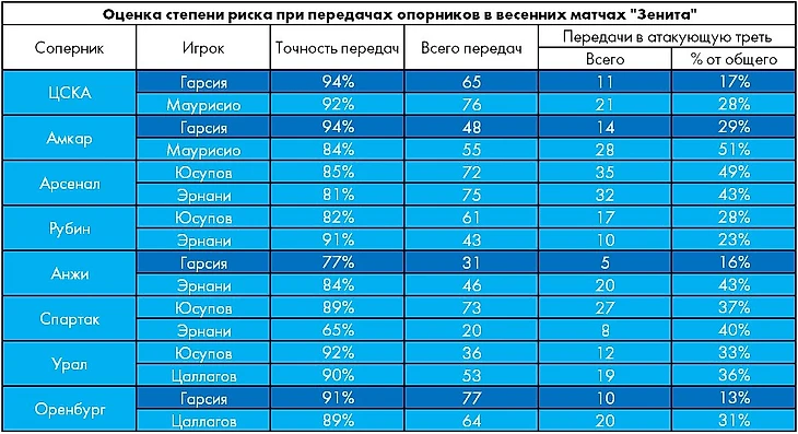 Хави Гарсия чаще всех встречался с мячом в центре поля, но категорически отказывался рисковать. Из 77 передач испанца только 10 были направлены в зону атаки (13%), что является худшим показателем для зенитовских опорников этой весной.