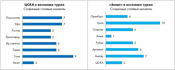 В весенних турах красно-синие создают почти на 40% больше голевых моментов, чем это было осенью при Слуцком (5,88 против 4,28 в среднем за матч) и, что важно, обходятся без явных спадов. Другой соискатель путёвки в главный клубный евротурнир «Зенит», напротив, заметно сбавляет обороты (5,13 весной против 5,35 осенью) и не демонстрирует должной стабильности.