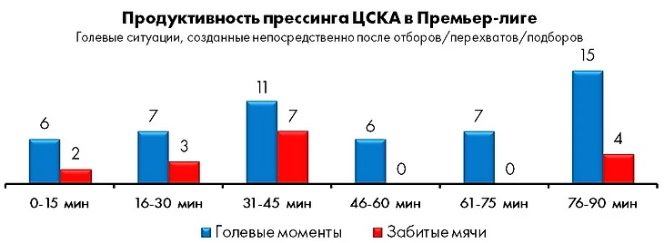 Во-вторых, на отрезке с 31-й по 45-ю минуту армейский прессинг имеет максимальную голевую отдачу.