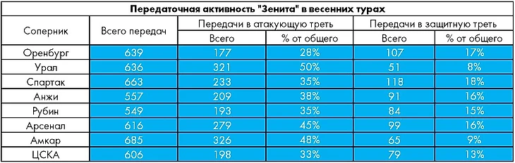 В матче с «Оренбургом» зенитовцы сделали катастрофически мало передач в атакующую треть поля (лишь 30% от общего количества – абсолютный минимум в весенних турах), причем по этому показателю их преимущество над хозяевами оказалось минимальным (177 против 155 – и это при такой-то разнице во владении!).