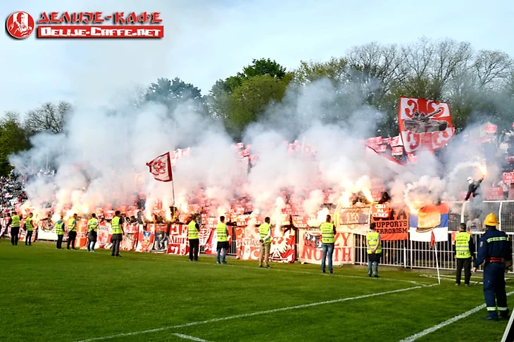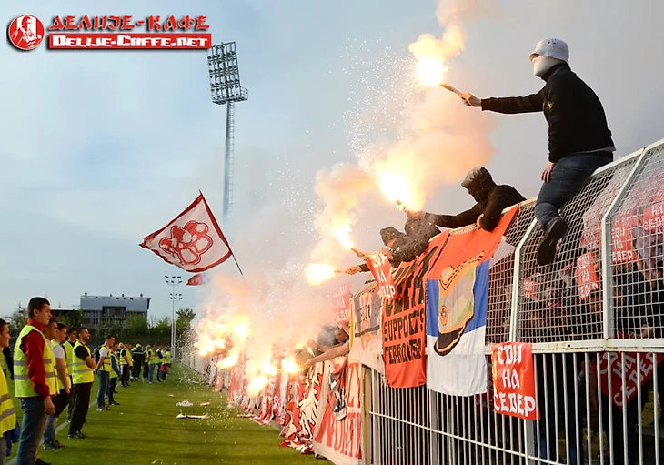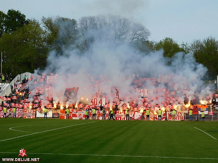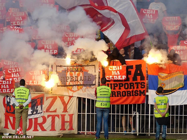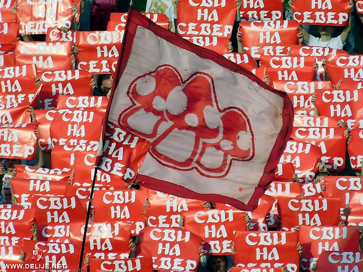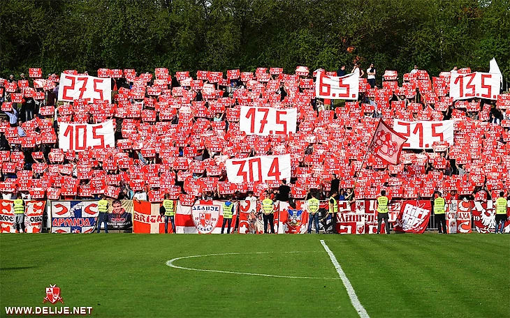 На игру против клуба "Чукарички" парни из "Делие" приготовили агитационный перфоманс, призывающий всех "звездашей" к мобилизации на оставшиеся матчи сезона. 7 баннеров с датами обозначали 7 заключительных матчей сезона, а фоном послужили красные модули с призывом "Сви на Север!" ("Все на Север!"). Причём "Делие" призывали не просто придти на эти матчи, но и присоединиться к ним и к активной поддержке команды на фанатской трибуне. Схема проведения чемпионата Сербии нестандартна - после регулярного сезона в привычном нам формате (16 команд, каждый играет с каждым в 2 круга - итого 30 туров) таблица делится пополам: первая восьмерка разыгрывает чемпионство и путёвки в еврокубки, а вторая восьмерка борется за выживание. Матчи между восьмёрками играются в один круг.