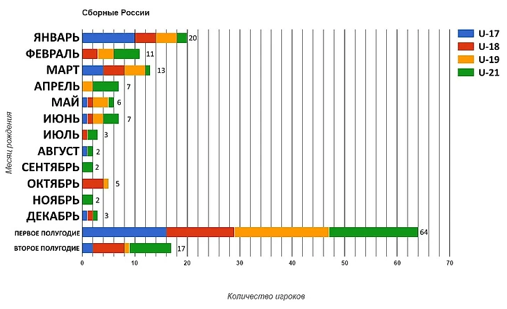 «Ну это Канада и хоккей» — подумал я, изучая труды Гладуэлла. Возможно в России и футболе дела обстоят иначе? Изучив состав сборной России U-17, я получил следующие результаты: